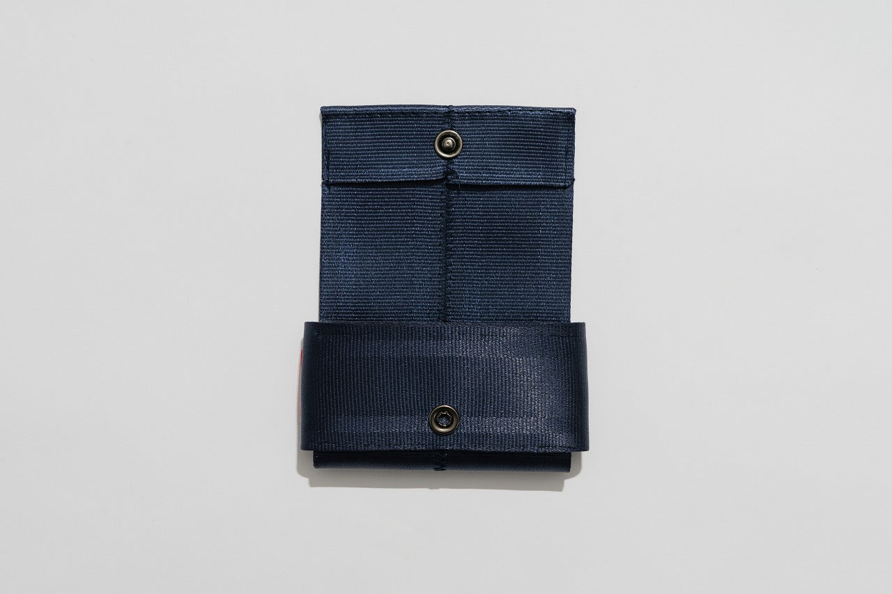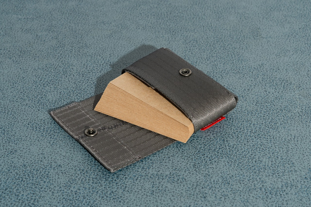 Think Scrapの名刺入れは、廃棄予定だった自動車用シートベルトの端材から生まれました。命を守るために設計されたその素材は、驚くほどの耐久性を持ち、あなたの大切な名刺をしっかりと守ります。表面にはシリコンコーティングが施されており、汗や皮脂による汚れを防ぎ、美しい状態を長く保ちます。