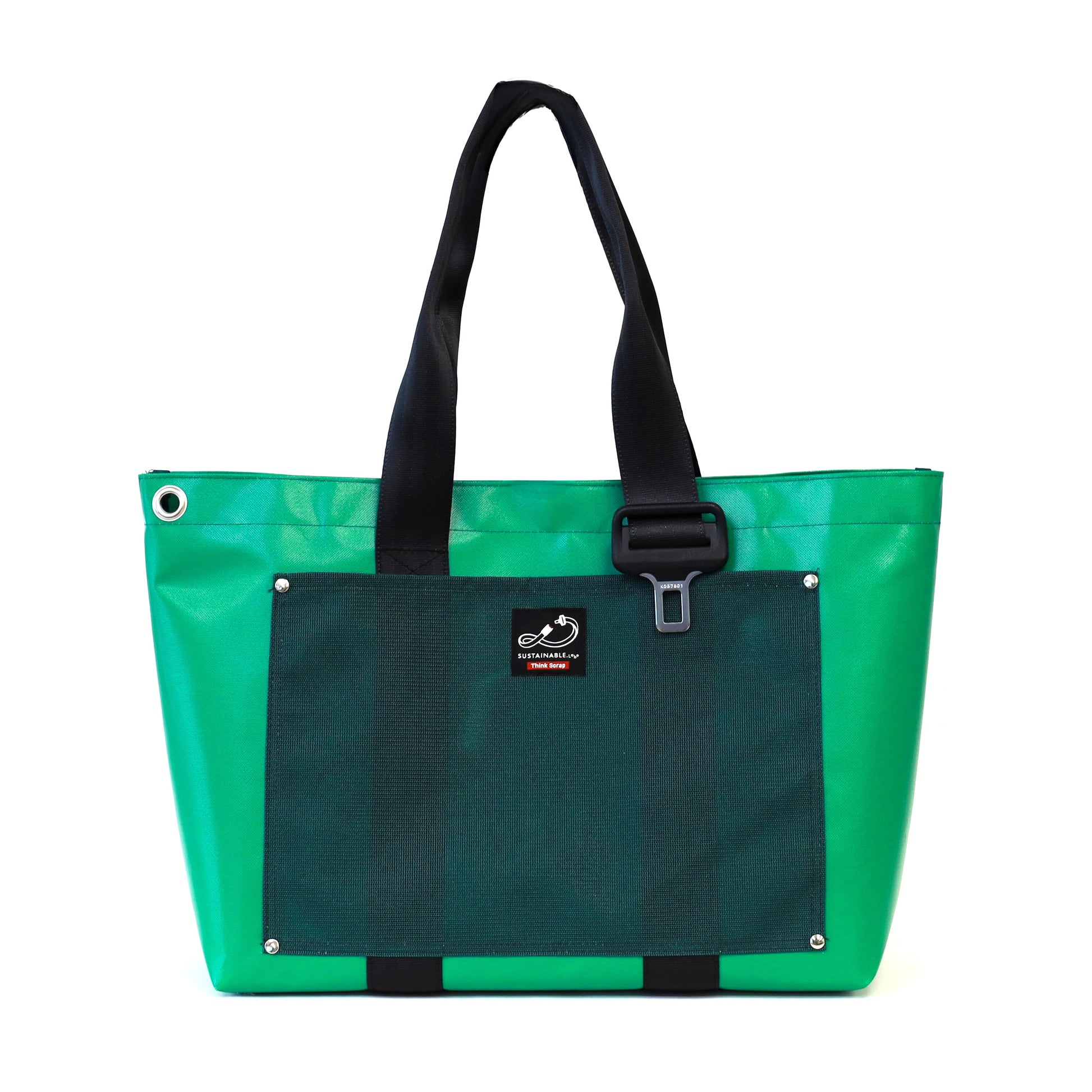 このトートバッグは、自動車用シートベルトとテント端材(膜材)という、通常は交わることのない素材の出会いから生まれました。どちらも製造工程でどうしても発生してしまう廃材。それらを再利用することで、廃棄物の削減と資源の循環を実現しています。