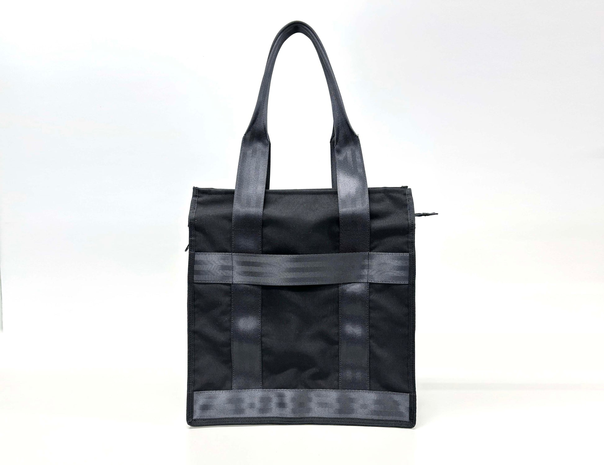 このトートバッグはシートベルト端材とテント端材を組み合わせることで誕生しました。捨てられるはずだった廃棄物に付加価値を与えることで、思いもよらないデザインや機能性に出会うことができます。またその時々の端材によってデザインは同じでも質感が変わるのが面白いポイントです。