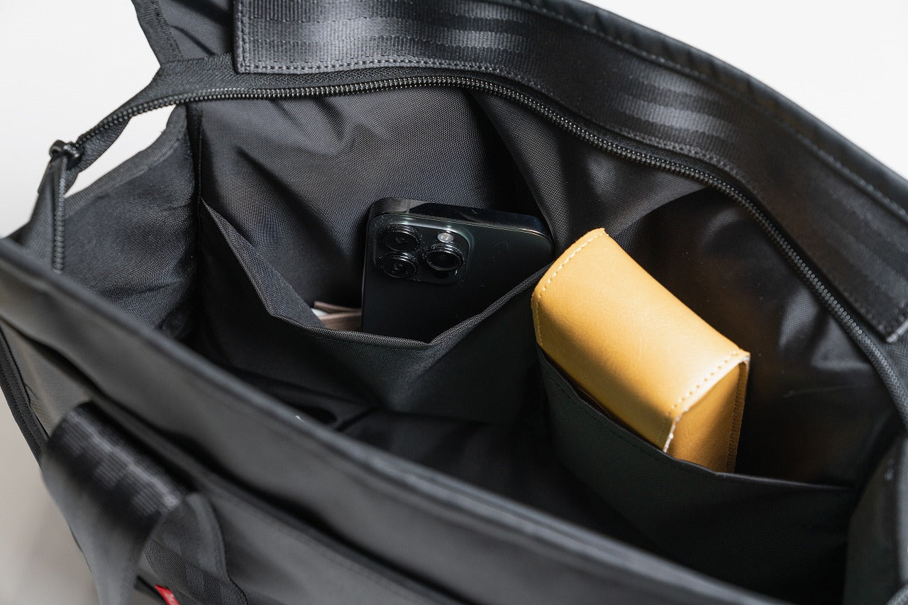 トートバッグ内側には「財布、携帯電話、名刺入れ」などの小物を整理するためのポケットが備えてあります。また小物ポケット対面には書類用のポケットも搭載しています。トートバッグ外側には「ファイルや雑誌」などを収納できるポケットがあります。また、バッグ背面にはキャリーケースのハンドルに取り付けられるよう専用のループが設けられています。