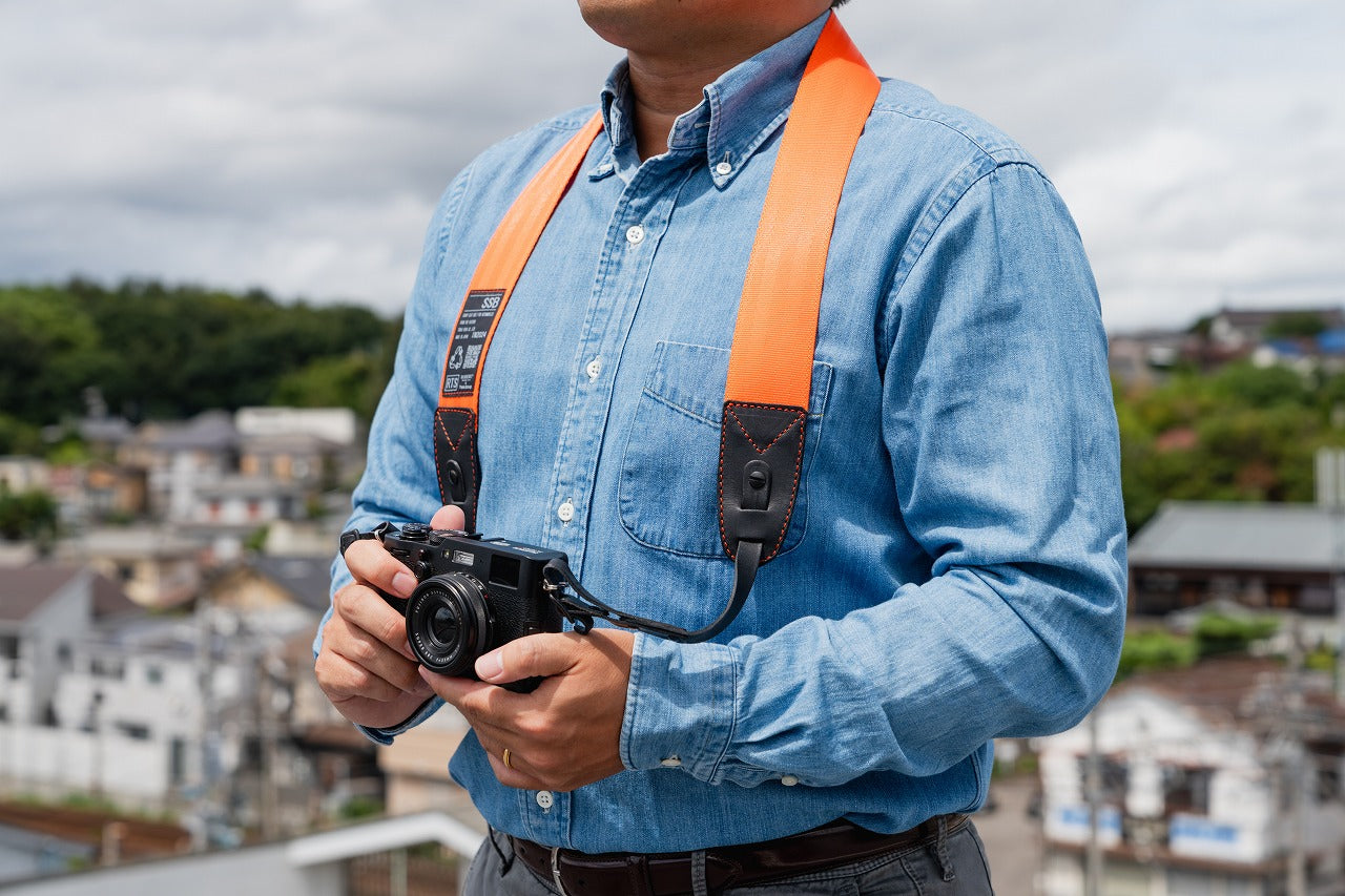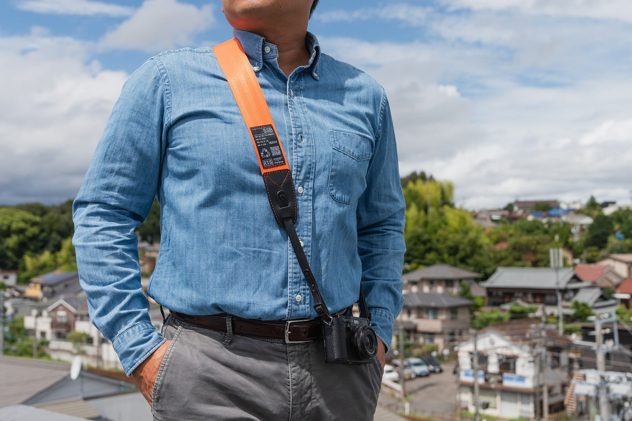 長時間のドライブでも不快感を感じさせない自動車用シートベルト。その滑らかな質感は、カメラストラップとしても理想的です。幅47mmの広めの設計で、肩や首にかかる負担を軽減。ストラップの全長は約118cm(レザーパーツ含む)で、首掛けにちょうどよい長さに仕上げています。サイズ調整の手間もなく、シンプルに使えるのが魅力です。